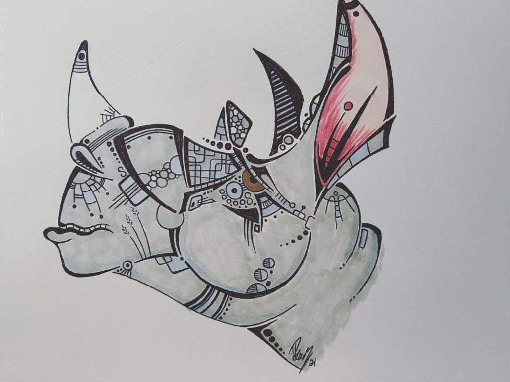 In this work, Patrick Hardy shifts from vertical monumentality to a more intimate, horizontal flow, presenting a form that feels less like architecture and more like a living body in motion. The drawing unfolds as a hybrid organism—part creature, part mechanism—its contours fluid, its interior alive with patterned systems and symbolic markings. Rather than standing upright like a totem, this form seems to drift, rest, or glide, inviting a slower, more contemplative engagement.
